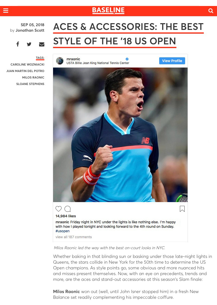 Milos’ 2018 US Open kit was inspired by his love for basketball. Keeping with the clean, modern aesthetic he’s known for, we gave him a timeless mitered tipped sport collar and bright but classic color lockups.